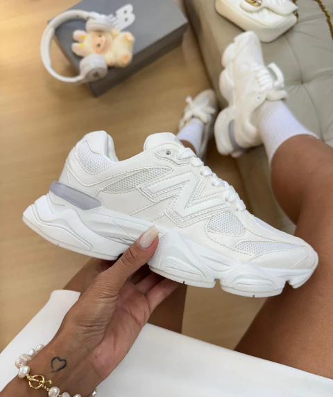 FORMA CERTA‼️‼️Eleve seu estilo com o New Balance 9060 Triple White, um tênis que une design futurista e conforto absoluto. Seu cabedal combina camadas de mesh respirável e sobreposições em couro premium, tudo no branco minimalista que é sinônimo de sofisticação.